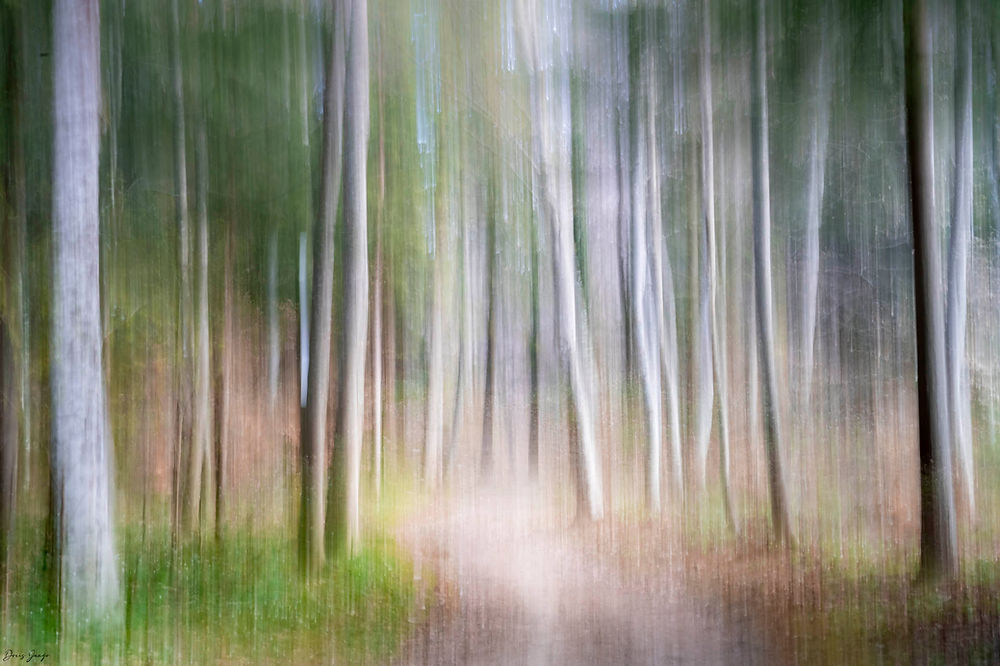 Pluie dans la forêt (ICM vertical et horizontal) Il pleuvine. Je sors. C’est l’été, l’air est très agréable. Je me dirige vers la forêt toute proche. La pluie caresse mon visage et mes bras. J’ai glissé la caméra sous mon t-shirt pour éviter qu’elle ne soit trop mouillée. Je quitte les sentiers battus et me retrouve dans les sous-bois. Ici, la pluie commence à jouer sa musique sur les feuilles, accompagnée du murmure du petit ruisseau. L’air est pur, la forêt déserte d’humain